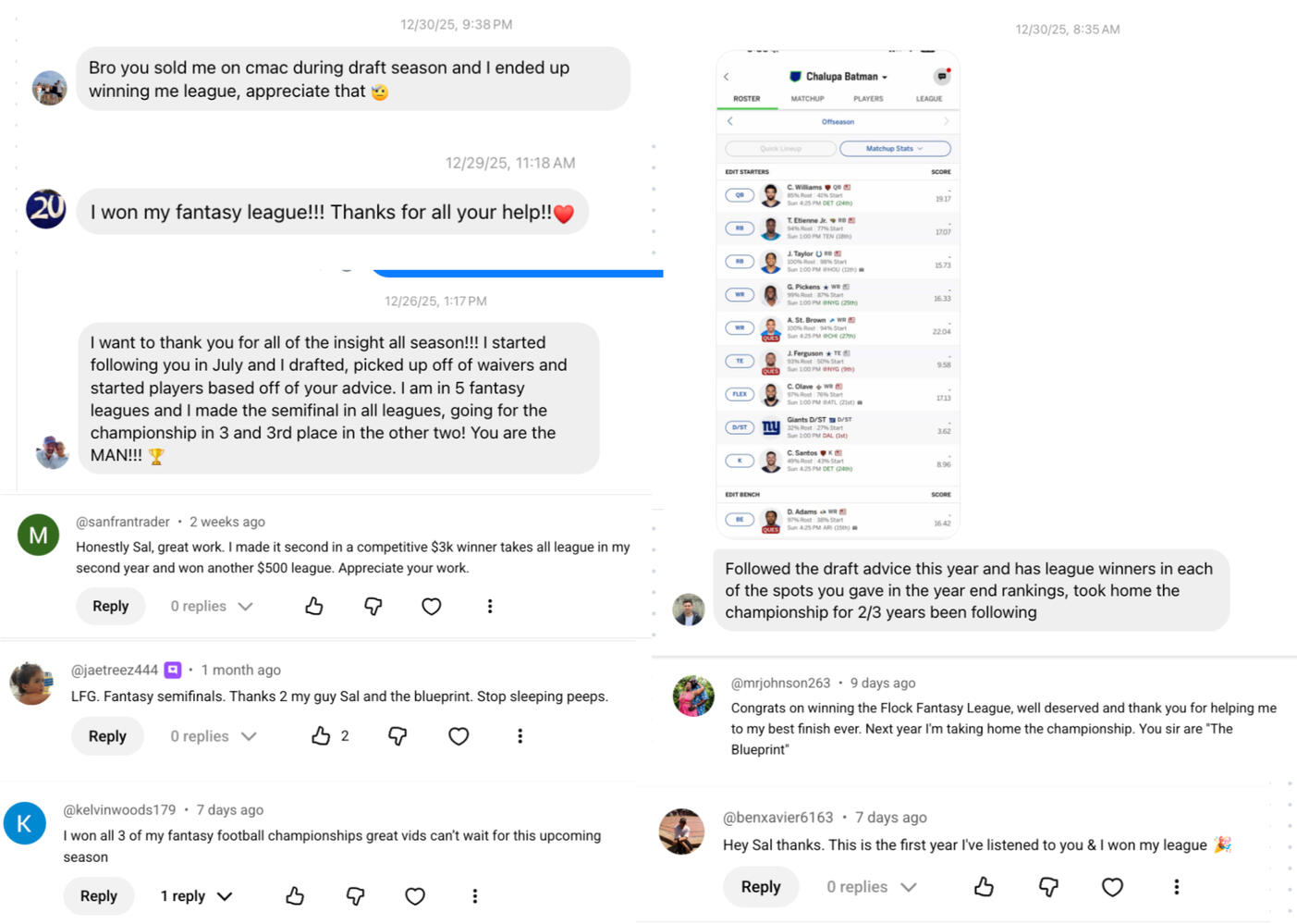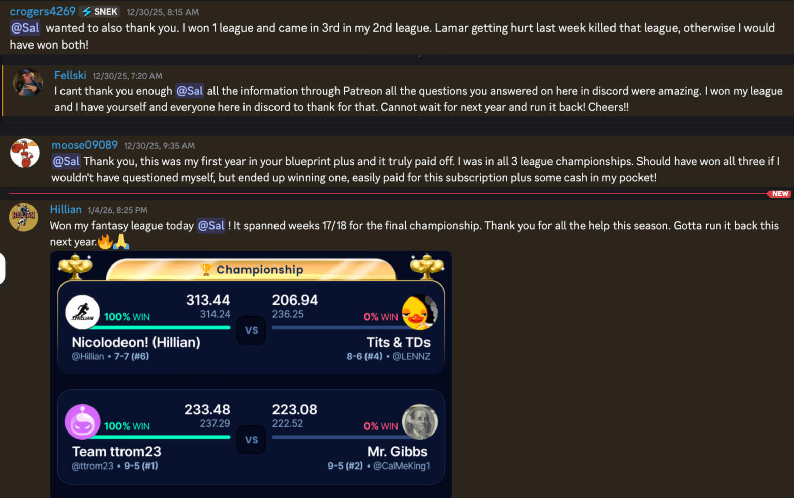 P.S. Fantasy Blueprint covers everything from draft day through championship weekEarly access subscribers get first in line and the best price we'll offer all year.And want to see what Blueprint members did with it last season?Check out just some of the league winners below.
