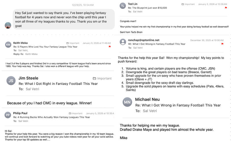 Within the next minute or two, you're going to get an email from me (Sal Vetri). It confirms your spot on the list and shows you exactly what's inside The Fantasy Blueprint.So be sure to check it out. If you don't see it in your inbox in the next couple of minutes, check your spam folder.
